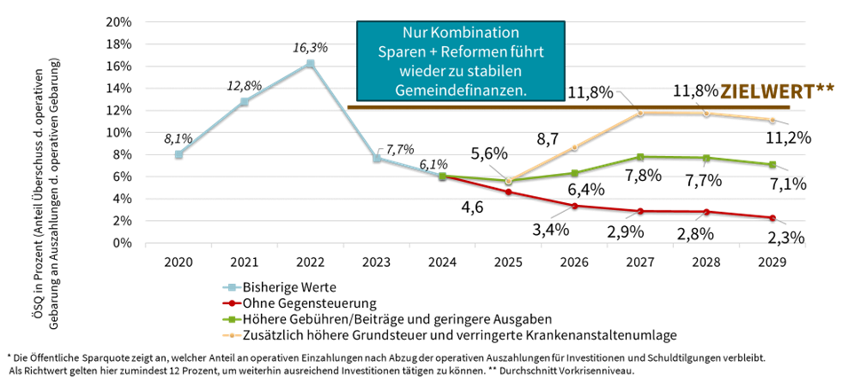Die Prognose der Gemeindefinanzen zeigt trotz Zusatzmittel aus dem Finanzausgleich 2024 und dem neuen Gemeindepaket von Anfang Juni 2024 eine kritische Finanzsituation der Gemeinden. Weiterhin ist davon auszugehen, dass bis zu 40 Prozent der Gemeinden ihre laufenden Ausgaben nicht mehr aus eigener Kraft decken werden können. Reformen sind notwendig, um die Liquidität mittelfristig wieder zu stabilisieren.